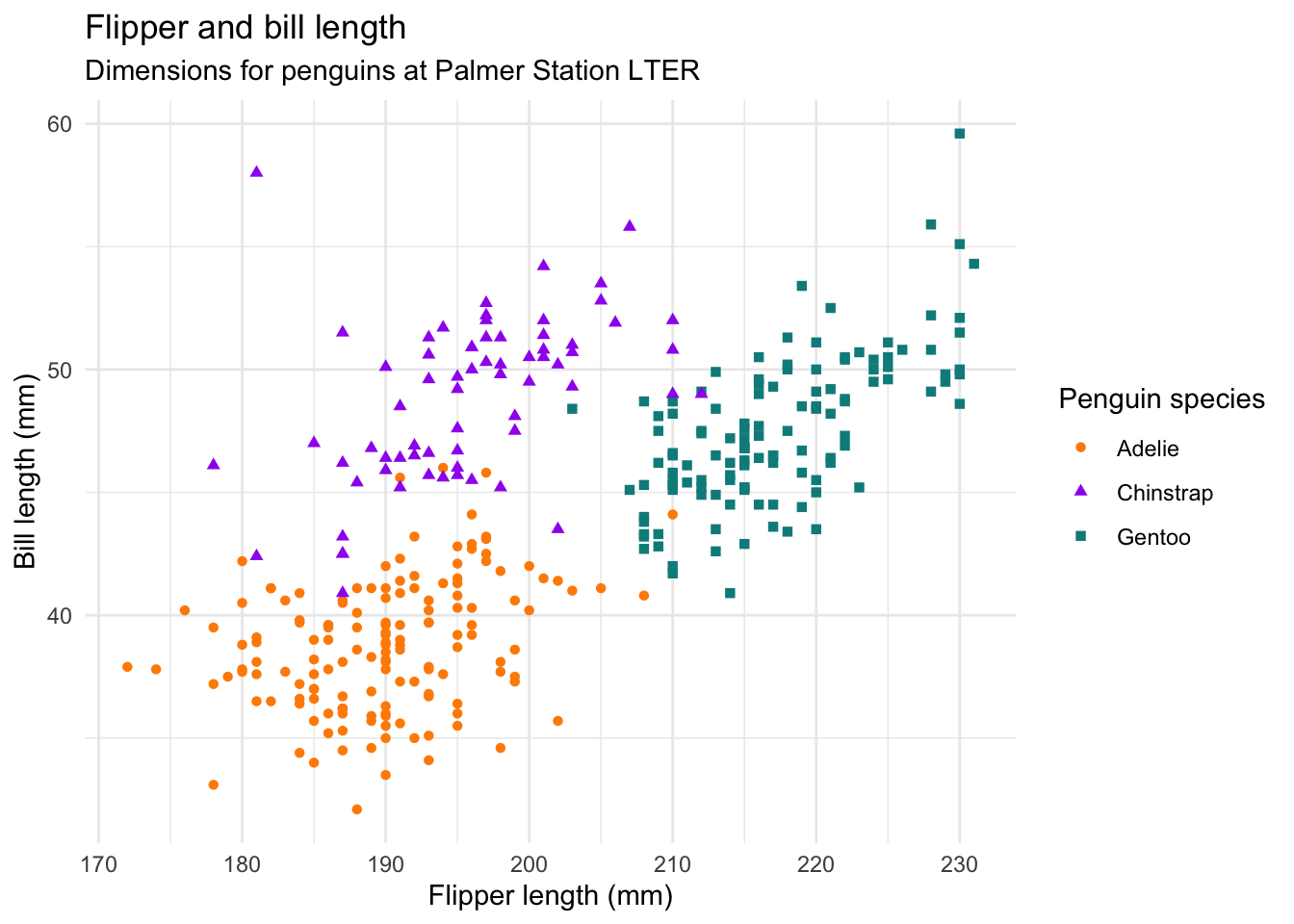 data from the palmerpenguins package contains size measurements for 344 penguins from three species observed on three islands in the Palmer Archipelago, Antarctica.